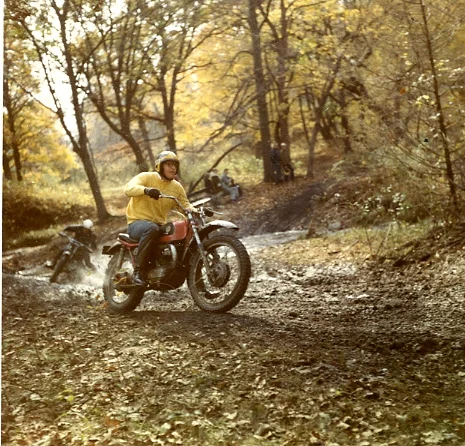 T: Yeah. The neat thing about the club was that there was such a mix of people there. Young undergrads like me, townies from Ames who we would hang out with at the Suzuki shop, graduate students, and married students. My best friend was ten years older, married with kids, and he was club president when I first joined. We would go out to this wooded land near the farm he was living at and just ride around out there. You think of Iowa as being flat, but there was a lot of land that was too hilly for farms, or had too many creeks in it or something, so they would just pasture animals there. We would rent about twenty acres, make a path, and then you could just ride around and around and around. There would be a work day where you would pull out stumps and stuff and then you'd say “Its time to ride!” and then you start racing each other around. It's physically very hard because you have to stand up on the pegs because the bike is bouncing around. The bike is trying to throw you off. Or, you are trying to turn a corner and the bike doesn't want to go, so you have to wrench it up. Or, you fall down and then you have to pick the thing up, start it, go again, get stuck, drag it out of the mud. If you are riding on the bumpy ground, bouncing and crashing around, even for us super tough twenty year olds, you'd say, "If I ride around one more time I'm gonna crash. I won't be able to hold on. If the handle bars twitch I'm just gonna have to let go and who knows what'll happen."