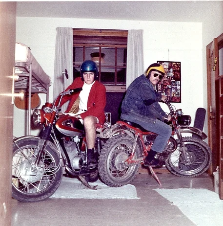 T: Ha. That's me on the Bultaco and my roommate Al at Iowa State. I think they were taking pictures for the dorm house directory? So, Al and I said, “Let's show 'em we're bikers.”