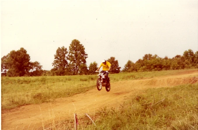T: I don't know. The hill climb events were a lot of fun. We would get just huge crowds. It's very dramatic. We also had motocross, an off road race on a dirt track. You'd do twenty laps or something. It's got humps and bumps and mud and stream crossings and probably a hill. There is a picture of me here doing a little jump. That was during a motocross.